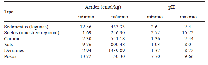 Los rangos de acidez y de pH varían de 0.398 a 800 y de 1.2 a 10.0, respectivamente (Cuadro III).