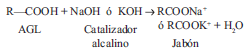 (1)La principal desventaja de la catálisis alcalina es su alta sensibilidad a la pureza de los reactivos, así como al contenido de ácidos grasos libres y agua. El contenido de ácidos grasos libres no debe exceder ciertos límites, debido a que pueden promoverse reacciones indeseadas de saponificación (reacción 2). Esto reduce la eficiencia del catalizador y el rendimiento de ésteres (biodiésel). Además dificulta los procesos de separación de ésteres y glicerol (Cao et al. 2006, Huang et al. 2010).