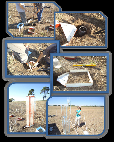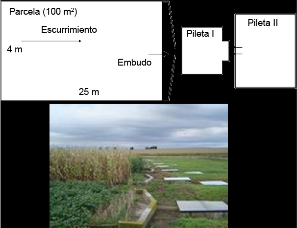 En el periodo julio de 2009 - noviembre de 2012 fueron recolectadas 93 muestras de agua de escorrentía en sistemas agrícolas (Cuadro I): 36 obtenidas mediante la utilización de un simulador de lluvia (Sasal et al. 2015; Fig. 2) y 57 en parcelas de escorrentía (con diferentes secuencias de cultivo) recolectadas a posteriori de eventos de precipitación que generan escurrimientos con lluvia natural (Sasal et al. 2010; Fig. 3).