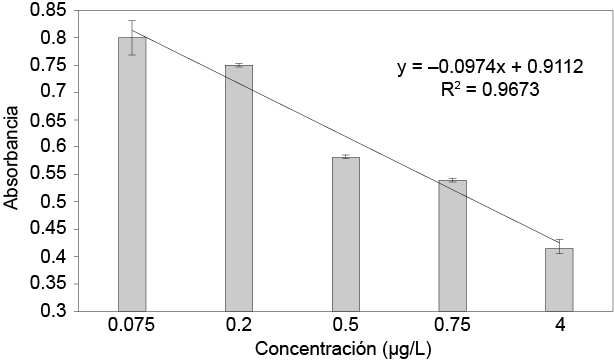 Las curvas de calibración se establecieron con soluciones patrón proporcionadas por Abraxis® en cuatro niveles de concentración, comprendidos entre 0.075 y 4 µg/L (0.075, 0.2, 1 y 4 µg/L), con tres repeticiones cada una. También se utilizó una solución de calidad analítica (0.5 µg/L), empleada como testigo interno de las soluciones patrón.