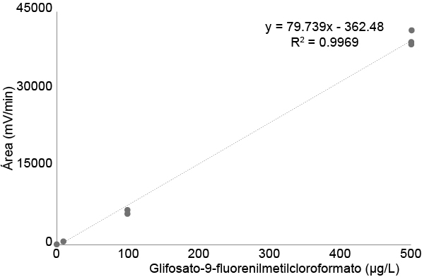 Los valores extremos de concentración de glifosato presentaron mayores desviaciones estándar (0.800 ± 0.032 µg/L y 0.418 ± 0.013 µg/L) respecto a las concentraciones intermedias. El estudio de linealidad de la técnica permitió detectar una correlación positiva entre las absorbancias y las concentraciones del patrón de glifosato (R2 = 0.9673), además de un muy buen ajuste del patrón interno de 0.5 µg/L, respecto al resto de las concentraciones patrón.