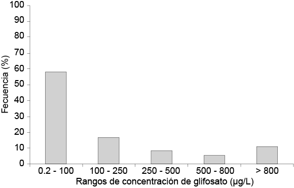 Las muestras de agua que resultaron positivas arrojaron concentraciones de glifosato entre 18.6 y 1552.9 µg/L (UHPLC-MS/MS). En la figura 6 se exponen las frecuencias porcentuales de los rangos de concentración del herbicida en las muestras que resultaron positivas. La mayor frecuencia (58.3 %) correspondió al rango 0.2 - 100 µg/L. Sólo en el 10.4 % (cuatro muestras) se detectaron valores superiores a los 800 µg/L, límite establecido por el Ministerio de Ambiente de Canadá (2012) para la protección de la vida acuática.
