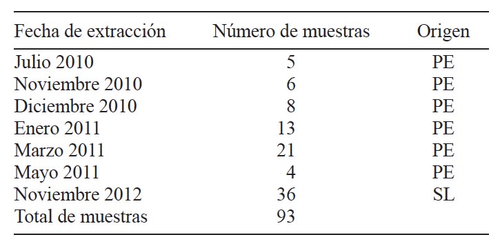 Las muestras se recogieron en recipientes de plástico de policloruro de vinilo (PVC) de 200 mL de color ámbar, previamente lavados con ácido clorhídrico acuoso (pH 2) y repetidamente enjuagados con agua desionizada. Durante el muestreo los recipientes fueron lavados dos veces con el agua a muestrear y posteriormente fueron tomadas las muestras, mismas que se rotularon y almacenaron a -20 ºC en condiciones de oscuridad hasta el momento de su análisis.