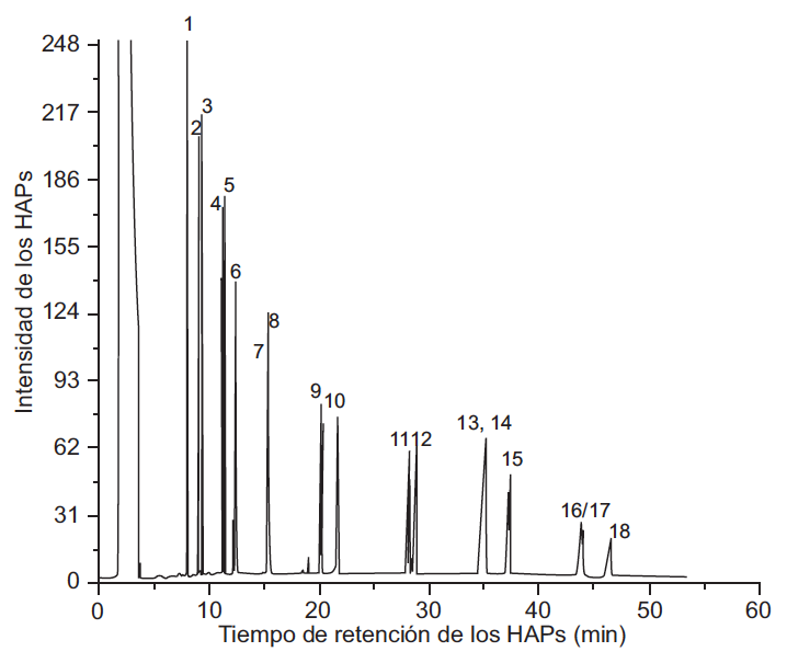 Para la identificación de los diferentes HAP presentes en el extracto global y las fracciones del PM2.5 de Villa del Rosario extraídos con diclorometano, se tomó como referencia el cromatograma de la muestra patrón de Restek de 18 HAP (EPA, Method 8310 PAH Mix) como se muestra en la figura 1. En este cromatograma los compuestos presentes en la muestra patrón son: 1) naftaleno, 2) 1-metilnaftaleno, 3) 2-metilnaftaleno, 4) cenaftileno, 5) acenafteno, 6) fluoreno, 7) fenantreno, 8) antraceno, 9) fluoranteno, 10) pireno, 11) benzo[a]antraceno,12) criseno, 13) benzo[b]fluoranteno, 14) benzo[k]fluoranteno, 15) benzo[a]pireno, 16) indeno(1,2,3-cd)pireno, 17) dibenzo[a, h]antraceno, 18.) benzo[ghi]perileno.