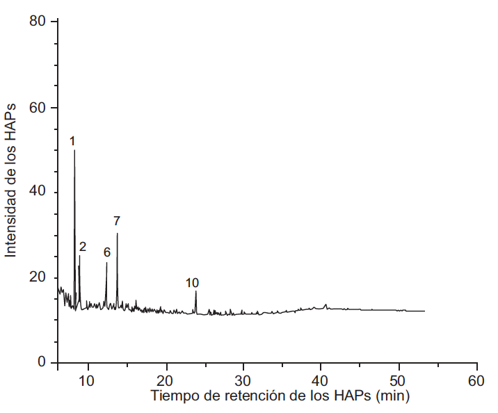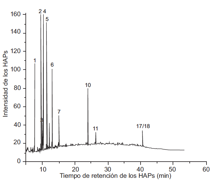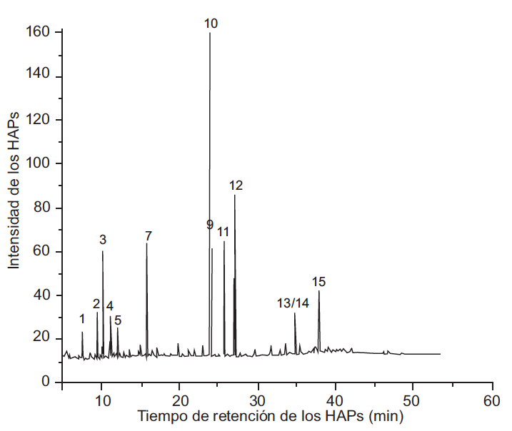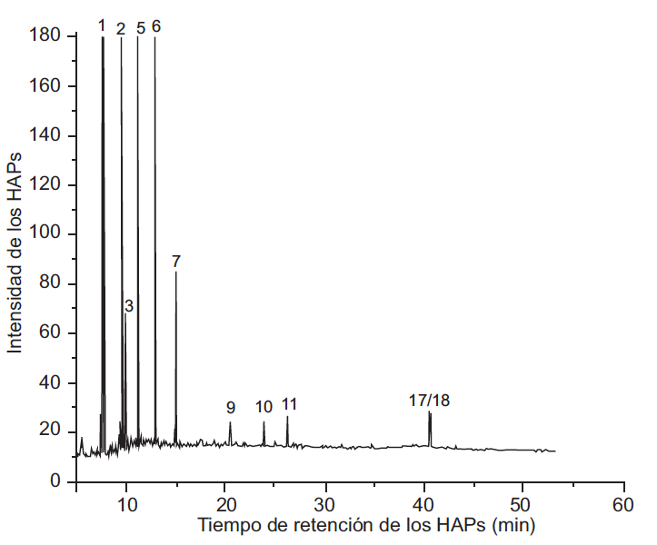 Para identificar los HAP presentes en la materia orgánica del PM2.5 del aire de Villa del Rosario (extracto global y las tres fracciones), se utilizó un cromatógrafo de gases marca Agilent Technologies 6890A Plus Series II Hewlet-Packard Plus con detector FID. La columna utilizada fue Restek Rxi-17 Sil, 30 m de longitud, 0.25 mm de diámetro, 0.25 μm de diámetro interno (silarileno similar a 50 % fenil/50 % dimetil polisiloxano). Para la identificación de los HAP se utilizó el patrón de 18 hidrocarburos de Restek (catálogo # 31841 EPA Método 8310 PAH Mixture). La identificación cualitativa de los HAP presentes en el extracto global se realizó de acuerdo con las siguientes condiciones: temperatura del inyector 250 ºC, detector FID a 320 ºC, mezcla (mL/min), aire 400 – H2 30 –N2 45. Se inyectó 1 µL, modo sin división. Condiciones del horno con una temperatura inicial 65 ºC por 0.5 min que se incrementa de la siguiente manera: 15 ºC/min hasta 200 ºC, 4 ºC/min hasta 330 ºC durante 15 min. Tiempo de análisis por muestra 53.33 min. Gas de arrastre helio, flujo 20 mL/min.