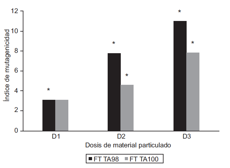 En esta prueba el indicativo de la mutación está dado por la reversión his– a his+, las revertantes se identifican porque crecen en medio mínimo sin histidina. Se trabajó con las cepas de Salmonella typhimurium TA98 y TA100. El bioensayo de Ames se realizó por triplicado con las cepas TA98 y TA100 para el extracto global y las diferentes fracciones de la materia orgánica (FT, F1, F2 y F3). Con cada muestra se trataron 108 bacterias y se utilizaron testigos positivos y negativos. Para el testigo positivo se utilizó 4-nitroquinolina N-óxido (4-NQO). Como testigo negativo se usó DMSO al 12 %. Para realizar los análisis mutagénicos se evaluaron tres concentraciones de MP (50 µg, 100 µg y 150 µg). Para verificar la reproducibilidad de los resultados se realizaron tres experimentos independientes, cada uno por duplicado. Para clasificar los extractos o las fracciones como mutagénicos o no, se calculó el índice de mutagenicidad (IM). IM = RI/RE, RI: revertantes inducidas por el tratamiento, RE: revertantes espontáneas (inducidas por el testigo negativo). El IM indica las veces que es superada la mutagenicidad del testigo negativo, para calcularlo se tomaron en cuenta los criterios de Flückiger-Isler y Kamber (2012), que establecen que ensayos en los que se obtenga un IM entre 2 y 3, indica que la sustancia probada tiene una mutagenicidad débil y que sustancias con resultados mayores a 3, tienen una mutagenicidad alta.