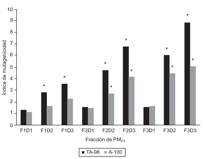 En la figura 7 se muestra el índice de mutagenicidad (IM) inducido por las diferentes fracciones del PM2.5 del aire de Villa del Rosario en las cepas TA98 y TA100 de Salmonella typhimurium. Si este índice es mayor o igual a 2, se considera una respuesta mutagénica positiva, lo que significa que en la muestra analizada existen compuestos químicos que están alterando el genoma de las bacterias analizadas. Como se observa en la figura 7, la fracción 3 (F3), es la que presenta mayor mutagenicidad. La razón de mutagenicidad es mayor en la cepa TA98, indicándonos que los compuestos presentes en esta muestra inducen principalmente mutación por pérdida o ganancia de bases. Los resultados observados se pueden atribuir a agentes mutagénicos presentes en el material particulado que pueden alterar el marco de lectura u originar sustitución de bases. Dichos agentes pueden ser derivados nitroaromáticos, HPA, metales y agentes cancerígenos amino (Kawanaka et al. 2008, Ianistcki et al. 2009). Gran parte de la actividad mutagénica encontrada en este estudio podría ser debida a dinitropirenos, compuestos que no requieren activación metabólica y lesionan el ADN originando pérdida o ganancia de bases (Kawanaka et al. 2008). Estos resultados son similares a los encontrados en las muestras de PM2.5 del aire de la ciudad de Pamplona Norte de Santander (Meléndez et al. 2012).
