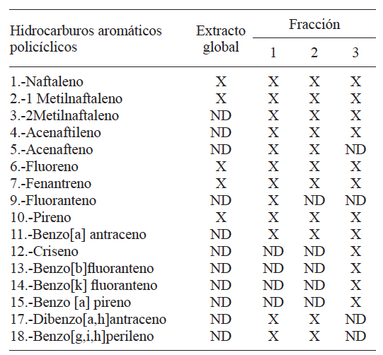 En el cuadro I se muestran los HAP extraídos con diclorometano (DCM), encontrados en el extracto global, así como en las tres fracciones del PM2.5 del aire de Villa del Rosario