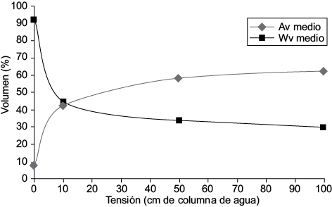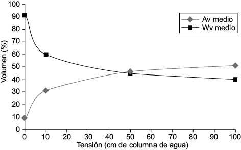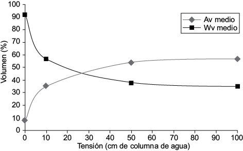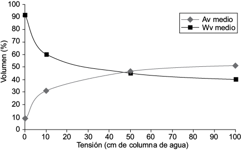 Para la caracterización física e hidrofísica de los sustratos es necesario determinar la curva de retención de humedad (o de liberación de agua) de los materiales que se utilizan como sustratos de cultivo. Esta curva fue desarrollada por De Boodt et al. (1974) y representa el porcentaje de humedad en volumen entre el porcentaje de materia seca en volumen, frente a la tensión aplicada a los sustratos en cm de altura de la columna de agua (10, 50 y 100 cm).