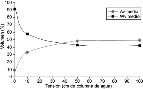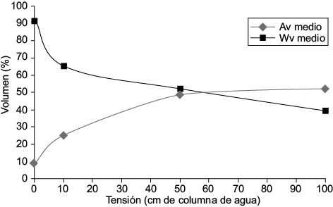 Valor R: se define como la succión a la que el volumen de aire es igual al volumen de agua (Felipó et al. 1979), se calcula como el punto de corte de la curva de humedad volumétrica con la del volumen de aire en las gráficas de distribución de la porosidad.