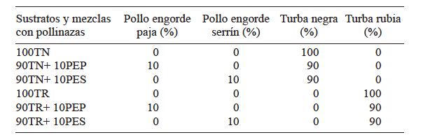 Las pollinazas no compostadas (PE) usadas en el ensayo provinieron de dos granjas situadas en la Comunidad de Castilla y León. Están constituidas por mezcla de heces, plumas y cama de paja de cebada, por lo que se le denominó “pollo de engorde-paja” (PEP) o de serrín de madera “pollo de engorde-serrín” (PES) (García et al. 2007). Las aves destinadas a producción de carne (pollos de engorde) se crían durante un ciclo de aproximadamente 45 días sobre un lecho o cama. Transcurrido este tiempo se retira de la granja dicho lecho para posteriormente preparar las distintas mezclas con turba negra y turba rubia introduciéndolas en un homogeneizador. Las muestras ensayadas aparecen en el cuadro I, en el que se puede observar el porcentaje en volumen (V/V) de la composición de las pollinazas y las turbas empleadas para la formación de los sustratos, con tres repeticiones.