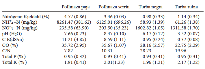En el cuadro II se presentan las propiedades químicas iniciales de las pollinazas y los sustratos estudiados. Se puede observar que el contenido de carbono orgánico fue similar cuando se comparan las dos pollinazas y las dos turbas, pero se encontraron diferencias al contrastar las pollinazas con las turbas. La relación C/N se redujo de manera importante para las pollinazas estudiadas, debido a su alto contenido en nitrógeno total.
