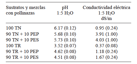 Alonso et al. (2012) estudiaron la influencia del pH y la CE de diferentes mezclas de sustratos y concluyeron que la supervivencia del cultivo no quedaba afectada en ninguna de sus mezclas, pero sí en su crecimiento, en el que se presentó una disminución con la mezcla de turba rubia (TR+PEP y TR+PES).