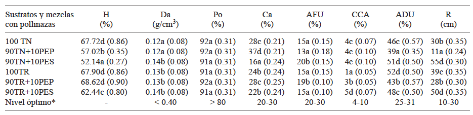 TN = Turba negra, TR = Turba rubia, PES = Pollo de engorde-serrín, PEP = Pollo de engorde-paja, H = humedad, Da = densidad aparente, Po = porosidad, Ca = capacidad de aireación, AFU = agua fácilmente utilizable, CCA = capacidad compensadora de agua, ADU = agua difícilmente utilizable, R = parámetro R. Letras distintas en la misma columna indican que existe diferencia significativa (P ≤ 0.05). Desviación estándar entre paréntesis
