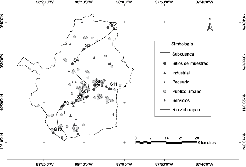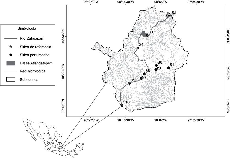 Para evaluar la condición del río se seleccionaron once sitios de muestreo (Fig. 1, S1 a S11), dos de ellos fueron sitios de referencia, localizados en ecosistemas forestales (S1 y S2), donde la perturbación por actividades humanas es mínima. Los demás sitios se ubicaron en áreas con influencia de alguno de los factores de perturbación de la condición del río: agrícola-pastizal (S3), agrícola (S4 y S11), urbano (S5, S9 y S10) e industrial y urbano-industrial (S6, S7 y S8). En todos los sitios se evaluaron en la primer quincena del mes de mayo de 2013 tres componentes: a) macroinvertebrados presentes, b) condición de hábitat y c) parámetros de calidad del agua. Se seleccionó un periodo de muestreo previo al establecimiento del periodo lluvioso para evitar alteraciones del caudal y de la presencia de macroinvertebrados.
