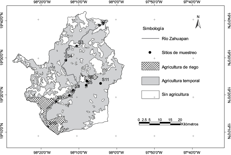 El estudio se realizó en la subcuenca del río Zahuapan (Fig. 1), la cual tiene una superficie de 1632.7 km2. El clima predominante es templado subhúmedo y solamente en las áreas con mayor altitud se presenta un clima semifrío subhúmedo. En la zona de estudio los tipos de vegetación que predominan son el pastizal, el bosque de táscate, el bosque de pino y el bosque de encino. En la subcuenca está asentada el 61.18 % de la población del estado de Tlaxcala (INEGI 2010) y se tiene la presencia de una zona industrial importante.