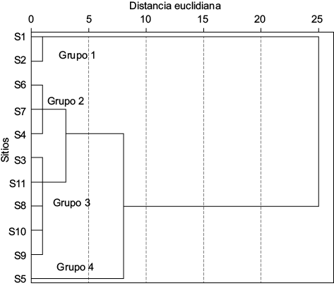 Se realizó un análisis de conglomerados, utilizando el programa SPSS (Statistical Package for Social Sciences) versión 17, con los valores de condición de hábitat para identificar la agrupación de los sitios y observar si los sitios de referencia se separan de los sitios perturbados. Con base en el dendograma obtenido se identificaron grupos con diferente condición de hábitat.