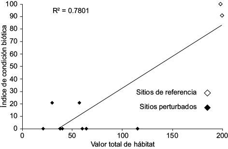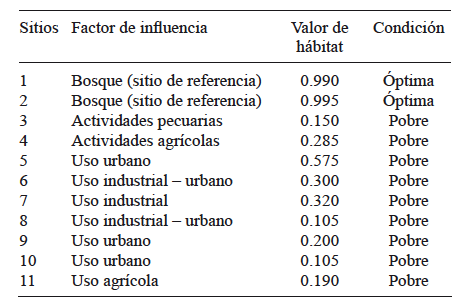 El valor del índice de condición de hábitat indicó que a pesar de las diferencias en el grado de perturbación a lo largo del río, todos los sitios perturbados tienen una condición de hábitat pobre (Cuadro IX).