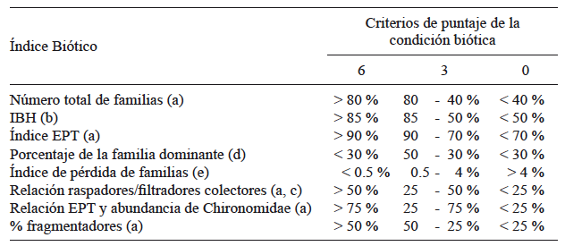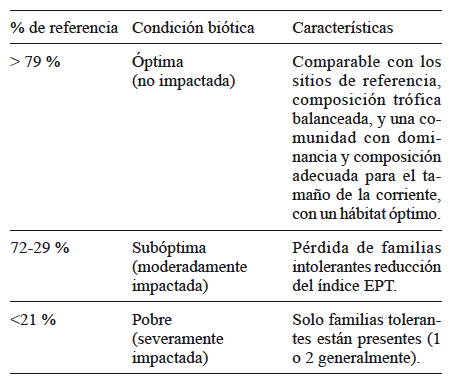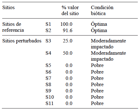 Se obtuvo la suma de puntaje de todos los índices bióticos para cada sitio. Se calculó el porcentaje que representó el puntaje de los sitios perturbados en relación con el puntaje del sitio S1. El valor obtenido (% de referencia) se comparó con los valores del cuadro II para determinar la condición biótica del sitio.