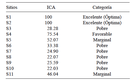 Se calculó el índice de calidad del agua (ICA) propuesto por el Consejo Ambiental de Ministros de Canadá (CCME 2001):