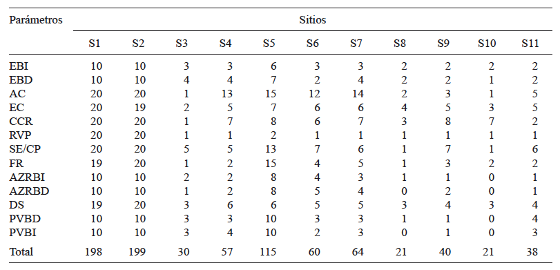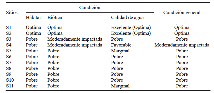 Se tabularon las categorías de calidad de los sitios obtenidos por las evaluaciones parciales de condición biótica, de hábitat y de calidad de agua. Se tomóla moda de la condición de las tres categorías como lacondición representativa del sitio.
