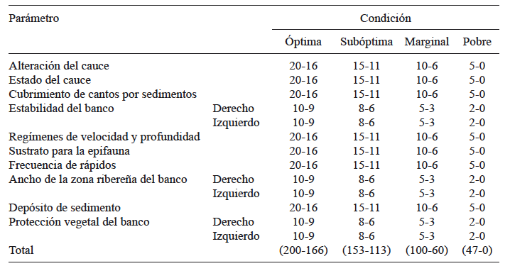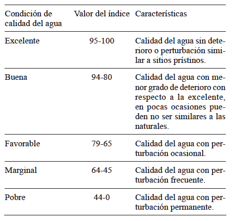 Debido a que en México no existen valores de referencia para los parámetros físicos y químicos de calidad de agua en ríos, el fósforo total, la demanda biológica de oxígeno (DBO5) y la temperatura se compararon con los valores de la NOM-001-SEMARNAT-1996, la cual establece los límites máximos permisibles de descargas de aguas residuales en aguas y bienes nacionales. Para el oxígeno disuelto, amonio y pH se consideraron valores de la Norma Canadiense para la Protección de Vida Acuática (CCME 2001, CCME 2007). El valor de referencia del total de sólidos disueltos en ríos se basó en los valores establecidos por el Departamento de Recursos Naturales del Estado de Iowa (IDNR 2009). La asignación de la condición del río se realizó conforme a los rangos de la Norma Canadiense para la Protección de Vida Acuática (CCME 2001), descritos en el cuadro IV.