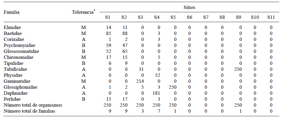 Se determinó la tolerancia de los organismos identificados a la perturbación de la calidad del agua del río y se identificó el grupo funcional de alimentación al que pertenecen (raspadores, depredadores, colectores, filtradores o fragmentadores), de acuerdo con los cuadros reportados por Bouchard (2004). Con las familias identificadas y el número de individuos por familia se calcularon los valores para cada sitio: número total de familias; número de familias de los órdenes Ephemeroptera, Plecopera, Trichoptera; porcentaje compuesto de Ephemeroptera, Plecoptera, Trichoptera (% de EPT); porcentaje de Ephemeroptera; porcentaje de organismos tolerantes; Índice Biótico de Hilsenhoff (IBH); porcentaje de la familia presente más dominante (% de familia dominante); porcentaje de raspadores; porcentaje de depredadores; porcentaje de colectores; porcentaje de filtradores y porcentaje de fragmentadores. El IBH en cada sitio se calculó con la fórmula: IBH = ƩXiTi/n, donde Xi es el número de ejemplares de cada familia; Ti corresponde al valor de tolerancia para dicha familia y n es el número total de organismos recolectados en la muestra.