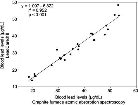 Figure 1shows the significant correlation (p = 0.001) between the BLL in the potters analyzed by GFAAS and LCS in concentrations ranging from 20.9 to 53.3 and 13.7 to 52.1 µg/dL, respectively.