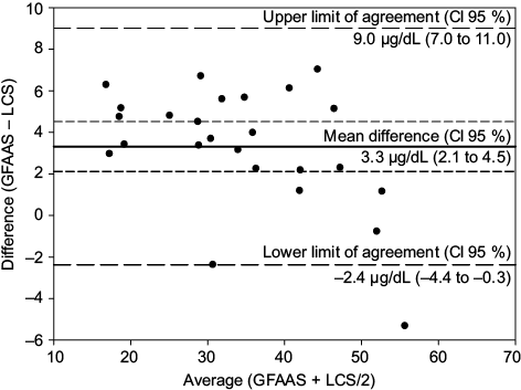 The Bland-Altman plot illustrates the mean difference and the LA between both methods as well as the 95 % CI. The mean difference (Fig. 2) indicates that BLL obtained through LCS method were 3.3 µg/dL lower than those measured by using GFAAS method, showing a CI between 2.1 to 4.5 µg/dL and a standard deviation of 2.9 µg/dL. The lower and upper limits of agreement between both methods ranged from –2.4 µg/dL to 9.0 µg/dL, respectively.