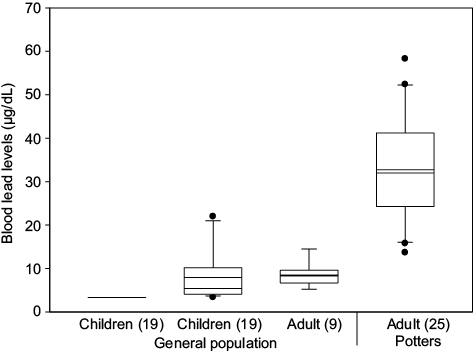 The exposure lead risk becomes evident when comparing the results with the NOM-199-SSA1-2000 (SSA 2000) and the protection guideline proposed by the CDC (2012). In this research paper 60 % of the potters are classified in the category II (25 to 44 µg/dL) and 16 % are assigned to category III (45 to 69 µg/dL), established in the Mexican regulation as key actions to protect human health (SSA 2000). The 86.8 % infantile population falls into the category I given that has concentrations of less than 10 µg/dL. Three children were encountered in the category II (10 to 14 µg/dL), and two in the category III, since had concentrations ranging from 21 to 22 µg/dL.