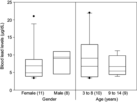 Environmental intervention, eating habits changes, or redistribution of blood lead to other tissues such as bones, are variables that have an influence on a BLL decrease regarding the age. Children aged 0, 6, 12, and 60 months inhabiting in the surroundings of a smelter in Torreón, state of Coahuila, México, presented BLL median which decreased with age: 10.12 µg/dL (1.9 to 43.8), 8.75 µg/dL (1.85 to 41.45), 8.4 µg/dL (1.7 to 35.8), and 4.4 µg/dL (1.3 to 30.3), respectively (Rubio-Andrade et al. 2011). In this work a similar trend was observed, children aged 3 to 8 years had a BLL (median 6.8 μg/dl, range 3.4 to 22) greater than children between 9 and 14 years old (median 5.4 µg/dL, range 3.9 to 11.2), however there were no significant differences.