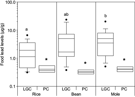 The acid foods extract lead by lixiviation from lead-glazed clay containers. It should be mentioned that the three foods have an acid pH (rice = 4.88 ± 0.30, beans = 4.86 ± 0.50, and mole = 5.50 ± 0.37). The lead concentration in mole (3.5 µg/g, IQR = 6.4) was statistically higher (p < 0.05) than in rice (1.1 µg/g, IQR = 2.9), but similar to beans (1.7 µg/g, IQR = 5.8). The foods cooked in pewter containers showed lead concentrations significantly lower (p < 0.05) than those cooked in lead-glazed clay containers, since the values were 0.36 µg/g (IQR = 0.18) for rice, 0.32 µg/g (IQR = 0.08) for beans, and 0.41 µg/g (IQR = 0.16) for mole. These FLL do not exceed the NOM-247-SSA1-2008 (SSA 2008) but surpass the international guidelines (WHO and FAO 2015).
