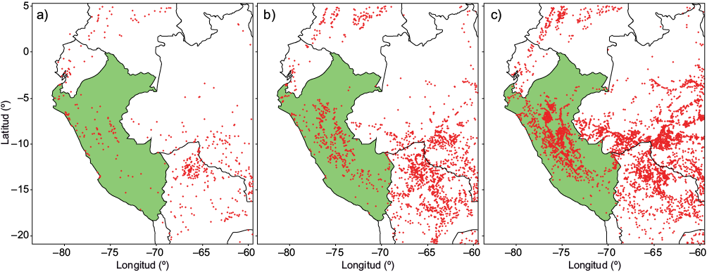 En lafigura 1 se muestran, con puntos, los focos de incendios en la región de estudio para los meses de junio, julio y agosto de 2015. Se aprecian puntos sobre Bolivia, Brasil y Perú en todos los meses, con un marcado incremento de un mes a otro. En el caso de Perú, la mayor parte de los focos se concentraron en la zona central del país, tanto zonal como meridionalmente. En el caso de Bolivia, los focos se concentran hacia la porción norte de la región representada en la figura y en el caso de Brasil hacia el suroeste del territorio enmarcado en el dominio de trabajo.
