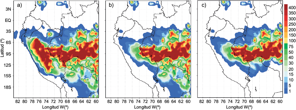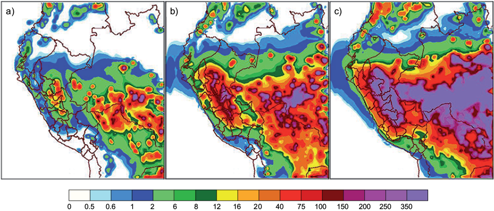 A modo de comprobación, se realizó una simulación para el 24 de agosto de 2015 a las 00 UTC (Plazo 54 h), incluyendo las emisiones producidas en Perú y fuera de este, considerando solamente las emisiones producidas en Brasil y Bolivia e incluyendo las emisiones producidas solamente en Brasil (Fig. 5). La figura 5b sugiere que cuando no se incluyen focos ubicados en Perú, se recibe la influencia de las emisiones de focos ubicados en Brasil y Bolivia, principalmente hacia el centro (y en menor medida hacia el norte) del territorio peruano. Esto se corresponde con la dirección del flujo predominante del Este-Sudeste mostrado en las figuras 3by 4b. Sin embargo, en la figura 5c se aprecia que mayoritariamente la influencia se recibe de Brasil, mientras que desde Bolivia es poco significativa.