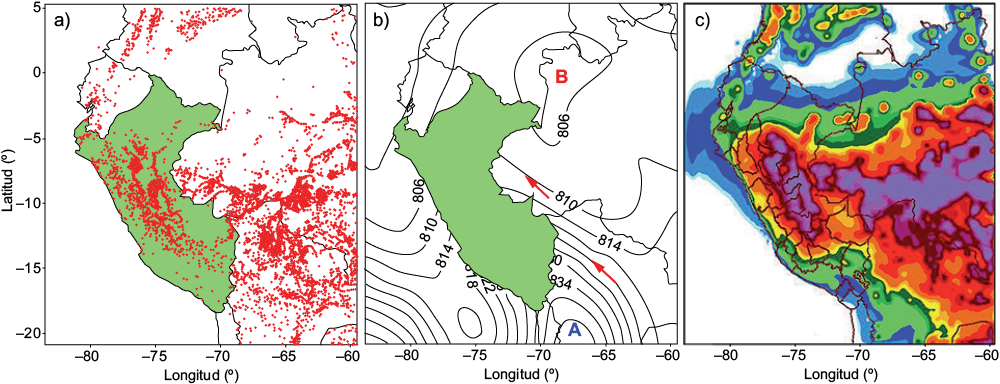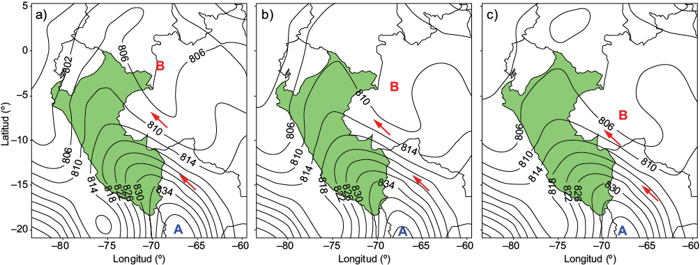 La figura 3 muestra los campos de altura de geopotencial medios entre los 1000 y los 850 hPa (troposfera baja) para el período 1979-2013, correspondientes a los meses de junio, julio y agosto. Se puede apreciar un centro permanente de altas presiones en la porción sur del territorio de Bolivia (“A” en azul) y una zona de bajas presiones en el oeste de Brasil (“B” en rojo), que originan un corredor de aire orientado hacia las regiones central y norte de Perú. Lo anterior sugiere un transporte de aerosoles hacia Perú desde los puntos de incendios ubicados en Brasil y Bolivia.