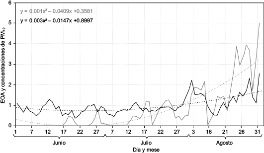 El EOA registró un incremento progresivo a partir de mediados de julio, que fue más notable durante el mes de agosto, en correspondencia con el incremento de las concentraciones de PM10. Los análisis realizados arrojaron un incremento de material carbonáceo, más notable en agosto, típico de las emisiones de partículas producidas por quema de biomasa. De todo lo anterior se infiere la necesidad de establecer una red de monitoreo de concentraciones de PM10, fundamentalmente en las regiones central y norte de Perú, dada la importancia que su control significa para la salud de la población.