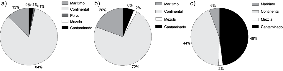 En la figura 7 se representan los porcentajes correspondientes a la clasificación de los diferentes tipos de aerosoles, para cada mes de los aquí analizados. En esta clasificación entran los aerosoles de tipo marítimo, continental, polvo, mezcla y contaminado. La mencionada clasificación se ha realizado de acuerdo con los criterios de Hess et al. (1998), Hoben et al. (2001) y Dubovik et al. (2002).