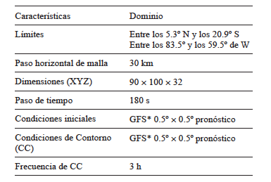 Para la implementación del modelo se emplearon las condiciones iniciales y de frontera del Sistema Global de Predicción (GFS, por sus siglas en inglés), con una resolución horizontal de 0.5º y limitada entre los 30º y los 120º de longitud oeste y entre los 60º de latitud sur y los 30º de latitud norte. Se utilizaron los datos pronóstico de las 00 del Tiempo Universal Coordinado (UTC, por sus siglas en inglés) hasta 72 h.
