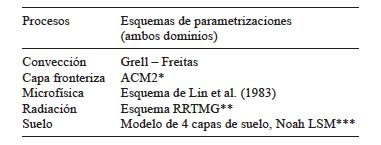 Los esquemas de parametrización utilizados se muestran en el cuadro II. Para la convección se seleccionó el esquema de Grell-Freitas (Grell y Freitas 2014). Otros esquemas de parametrizaciones que se describen en la literatura internacional son los de Kain-Fritsch (1990 y 2004), de Betts-Miller (ECMWF 1984), y de Grell y Devenyi (2002), entre otros.