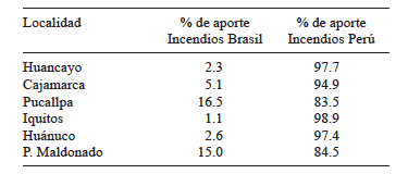 El cuadro III ilustra los porcentajes de aporte a las concentraciones de PM10 en diferentes localidades, de los incendios producidos en Perú y de los que ocurrieron en Brasil. Como se puede apreciar, el mayor aporte lo realizaron los incendios ocurridos en Perú, aunque hay un determinado aporte de los que tienen lugar en Brasil, más significativo en localidades cercanas a las fronteras, como son Pucallpa y Puerto Maldonado. De este cuadro se deduce que el aporte de los incendios producidos en Bolivia es insignificante, con solo 0.5 % en Puerto Maldonado.