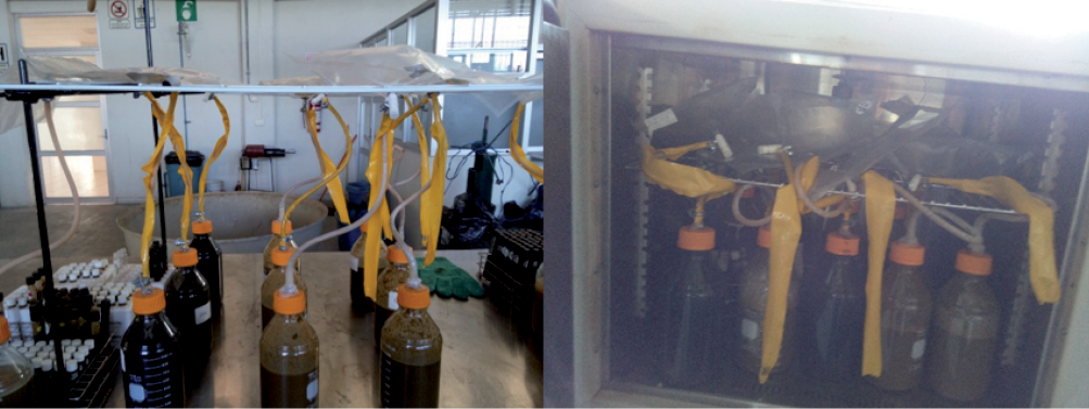 Para las unidades experimentales se utilizaron botellas de reacción de 1 L acopladas mediante una manguera a una bolsa para biogás de 1 L que sirvió como reservorio. Las botellas contenían 800 g de mezcla, la cual constaba de 10 % de SV (90 % pertenecían al sustrato y el 10 % al cosustrato). Se realizaron 3 tratamientos: T1) excretas de borrego-lodos, T2) excretas de borrego-rumen y T3) excretas de borrego. Cada tratamiento se realizó por triplicado. Las unidades experimentales estuvieron dentro de una estufa a 27 ºC para simular la temperatura promedio del estado de Tabasco, mismas que se mantuvieron en agitación diariamente a 900 rpm durante 20 min (Fig. 1).