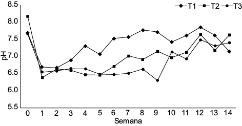 En la figura 2, se muestra la variación del pH para cada tratamiento. El T1 y T3, muestran un pH inicial cercano a 7.5, mientras el T2 tiene un pH inicial superior a 8. A partir de la semana 1, el pH de los 3 tratamientos se mantuvo en un valor cercano a 6.5. En las primeras 3 semanas se observan los pH más bajos (con excepción de la semana 9 para el caso de las excretas de borrego que presentan el pH más bajo durante el proceso), lo que indica que este periodo corresponde a la etapa acidogénica. Al finalizar las 14 semanas de proceso, los tres tratamientos terminaron con un pH similar, cercano a 7.5. De acuerdo con Lay et al. (1997), el rango óptimo de pH para el proceso de digestión anaerobia es de 6.6 a 7.6, por lo que el pH se mantuvo en condiciones óptimas para los tres tratamientos durante el proceso.