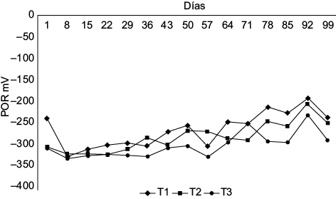 En la figura 3 se observa que desde el inicio de proceso tuvo un POR favorable, ya que para los tres tratamientos fue disminuyendo durante la primera semana y posteriormente comenzó a incrementarse a partir del día 36. De acuerdo con Flotats et al. (2001) el POR óptimo para el proceso es por debajo de –300 mV, valor que se mantuvo durante los primeros 36 días para el T1 y T3, y durante los primeros 29 para el T2. Durante el resto del proceso los valores oscilaron entre -200 mV y -300 mV, aunque los valores obtenidos no fueron los mejores en las condiciones óptimas, estos son aceptables.