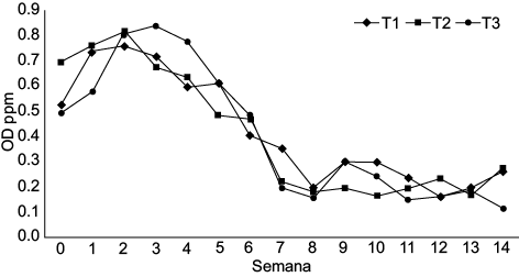 La figura 4, muestra los valores de OD, observándose que el comportamiento fue parecido para los tres tratamientos, aumentando durante las primeras 4 semanas y disminuyendo después de éstas.