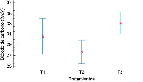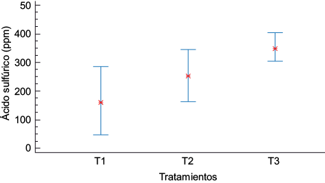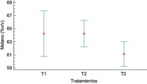 Se llevó a cabo un análisis de varianza de un factor, para encontrar diferencias significativas de los tres tratamientos evaluados (T1, T2 y T3), en la producción de CH4, CO2 y H2S. Asimismo, se aplicó una prueba múltiple de Tukey para determinar diferencias entre cada tratamiento. Para ello, se utilizó el programa STATGRAPHICS ® Centurion XV.II.