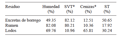 El contenido de humedad para el rumen fue 1.6 veces mayor que el de las excretas de borrego y 1.2 veces mayor que para los lodos (Cuadro I). En cuanto a los SVT, el lodo presenta menor cantidad, mientras las excretas de borrego y el rumen tienen cantidades parecidas. Los lodos tienen más de 60 % de cenizas en base seca, mientras los otros dos residuos alrededor de 10 %, es decir, los lodos contienen una mayor cantidad de minerales que los otros residuos. Esta característica puede permitir una mayor velocidad de crecimiento de las bacterias durante el proceso, lo cual se traduce en una producción de biogás con mayor rapidez.