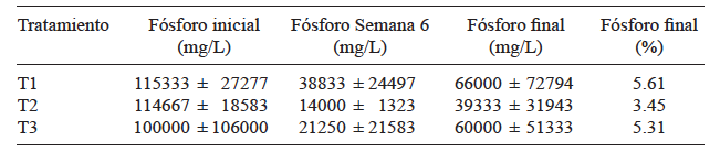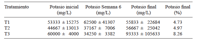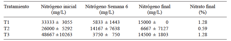 Nutrientes. Se analizó el contenido de nutrientes al inicio y al final del proceso, directamente en las unidades experimentales mediante el uso de un medidor multiparámetro marca Hanna® 83 225 con precisión de ± 10 mg/L para nitrógeno, ± 5 mg/L para fósforo y ± 30 mg/L para potasio.