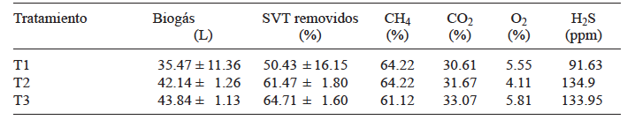 El Tratamiento 1 (excretas de borrego/lodos) es el que genera menor cantidad de biogás, 35.47 L, comparado con los tratamientos T 2 (excretas de borrego/rumen) y T3 (excretas de borrego), produciendo 42.14 L y 43.83 L, respectivamente. La composición del biogás en cuanto a CH4 y CO2 es muy similar en los tres tratamientos. Sin embargo, el T3 presenta menor porcentaje de CH4 (61 % contra 64 % de los otros tratamientos). El contenido de CH4 en el biogás es mayor a lo calculado teóricamente, así mismo el contenido de CO2 es menor. Por otro lado, el T1 es donde se obtuvo la menor concentración de H2S. El T1 se considera el mejor, ya que presentó menor concentración de H2S. Además, que es el tratamiento que comienza a generar biogás en el menor tiempo, en comparación con los otros dos. En la práctica esto implica una reducción en el tiempo de retención de los residuos y por ende un volumen de biodigestor menor, disminuyendo costos tanto para su construcción como por el tratamiento del biogás para la eliminación del H2S.