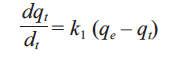The Lagergren model was the first rate equation (Lagergren 1898) applied for the adsorption of a solute in a liquid-solid system, based on the maximum adsorption capacity. It assumes that the rate of change of adsorbate uptake with time is directly proportional to the difference in the saturation concentration and the amount of solid uptake with time. The equation used to fit the adsorption data of Pb and Zn to the pseudo-first order kinetics, has the form of equation (1).