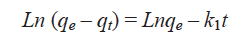 where k1 is the pseudo-first order adsorption rate coefficient, qe represents the maximum concentration of Pb or Zn adsorbed per unit mass of adsorbent at equilibrium, and qt the concentration adsorbed at any time t. To obtain the value of k1 the integrated form of equation (1) was used for the boundary conditions of t = 0, qt = 0, and t = t, qt = qt (Eq. 2). The value of k1 was obtained from the slope of the linear plot of ln(qe – qt) vs t. To fit adsorption data to this model, according to equation (2), the value of qe must be known.